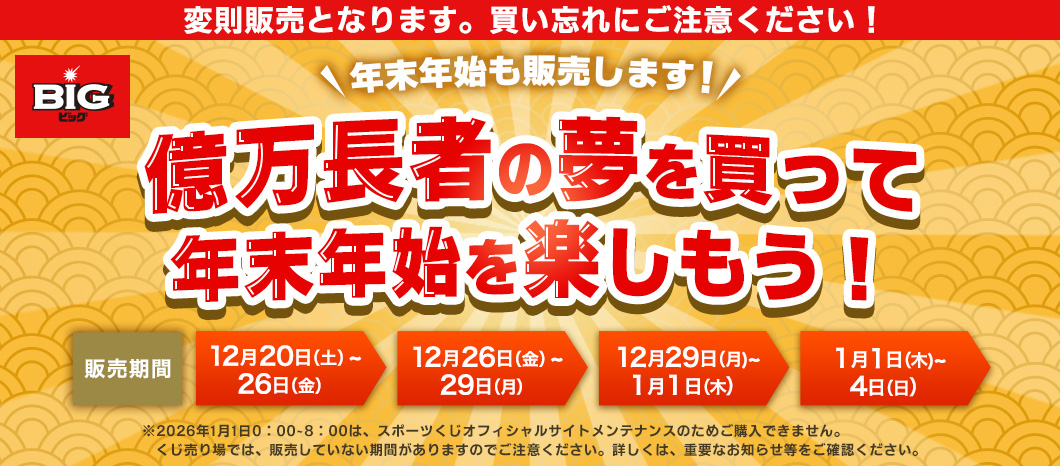 2026/1/1(木)AM0:00~AM8:00の間、スポーツくじオフィシャルサイトの定期メンテナンスのため、サービスを一時停止させていただきます。
